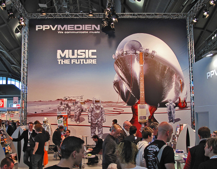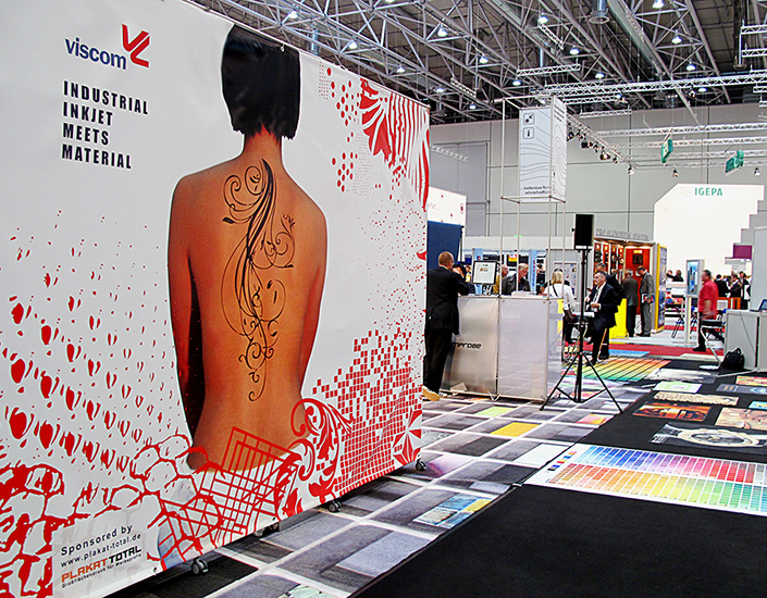 Messestand von raumprobe.de. Die Materialdatenbank für alle die was vorhaben. Einseitig bedrucktes PVC Banner, randverstärkt und geöst zur Verspannung am Messesystem.